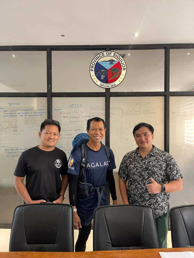 Standing between our OIC Provincial Tourism Officer, Atty. Dale Louis Tudtud (right) and Mr. Sheldon Baquilta from DENR (left), Mr. Lito De Veterbo, a trailblazer in his own right, embarked on a monumental journey to circumnavigate the healing island of Siquijor solely on foot.